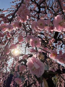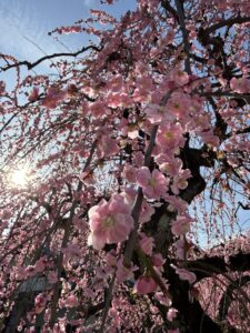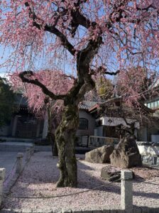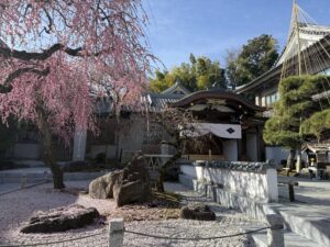 山門向かいの駐車場の河津桜は八分咲きになりましたが、境内、塀沿いの河津桜は2部咲です。